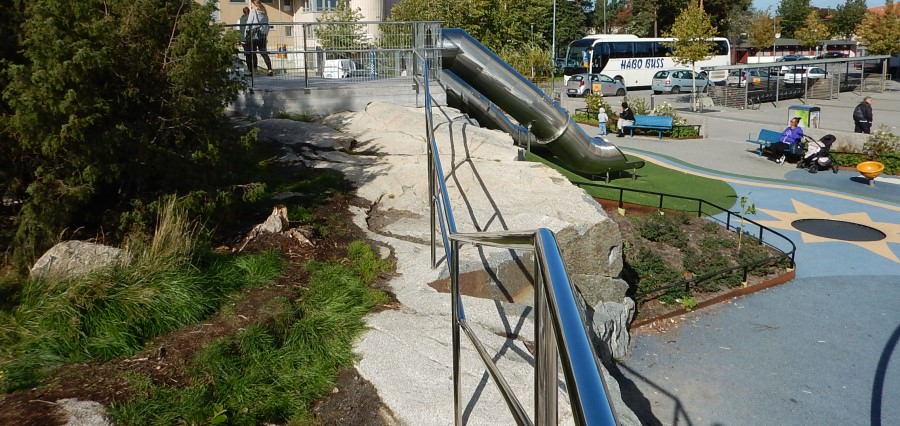 Lekplatsen är placerad i kanten av naturmark med berg som gränsar till anläggningen. Naturmarken och berget skulle enligt detaljplanen utnyttjas som parkmark och ”knapras i kanten” för att ge plats åt lek-platsen. Därmed gavs möjligheten att utnyttja en bergskärning vid gestaltningen, ett inslag som blev ett karaktärselement på lekplatsen. Lekplatsen innehåller många olika funktioner för lek och samvaro för mindre barn men även utrustning som lockar äldre barn, ensam eller i grupper av flera. Stor variation och omväxling skapas genom en palett av olika möjligheter till lek. Här finns kompisgunga, gungdjur, snurrkopp, piltunnel, studsmatta, tubrutschkanor med möjlighet att bestiga en grön vägg. Hopp och balanslek som sätter barnens motorik på prov. Ytskikten är till största delen gummiasfalt och konstgräs som ger god tillgänglighet, men även flis för ökad variation och upplevelse. Markmaterialet har getts en lekfull form – som en orm eller bäck som löper genom hela lekplatsen. Konst finns också på platsen i form av lekskulptur – ett ägg som man kan springa igenom eller leka inuti. Planteringarna är sammanhållna, med varierat innehåll, marktäckande, friväxande, lättskötta med enstaka solitära uppstickare för att få ett vackert och intressant utseende.